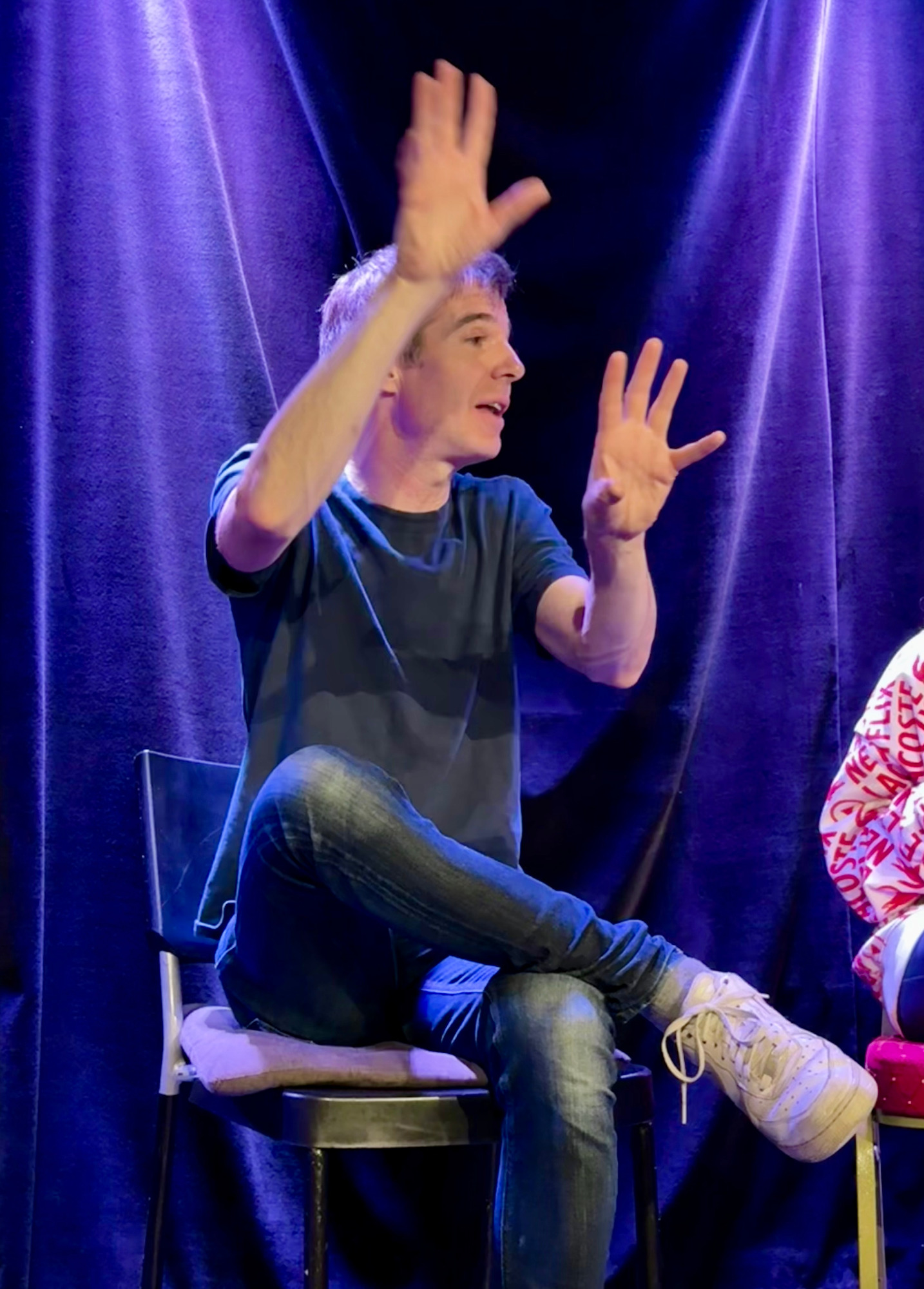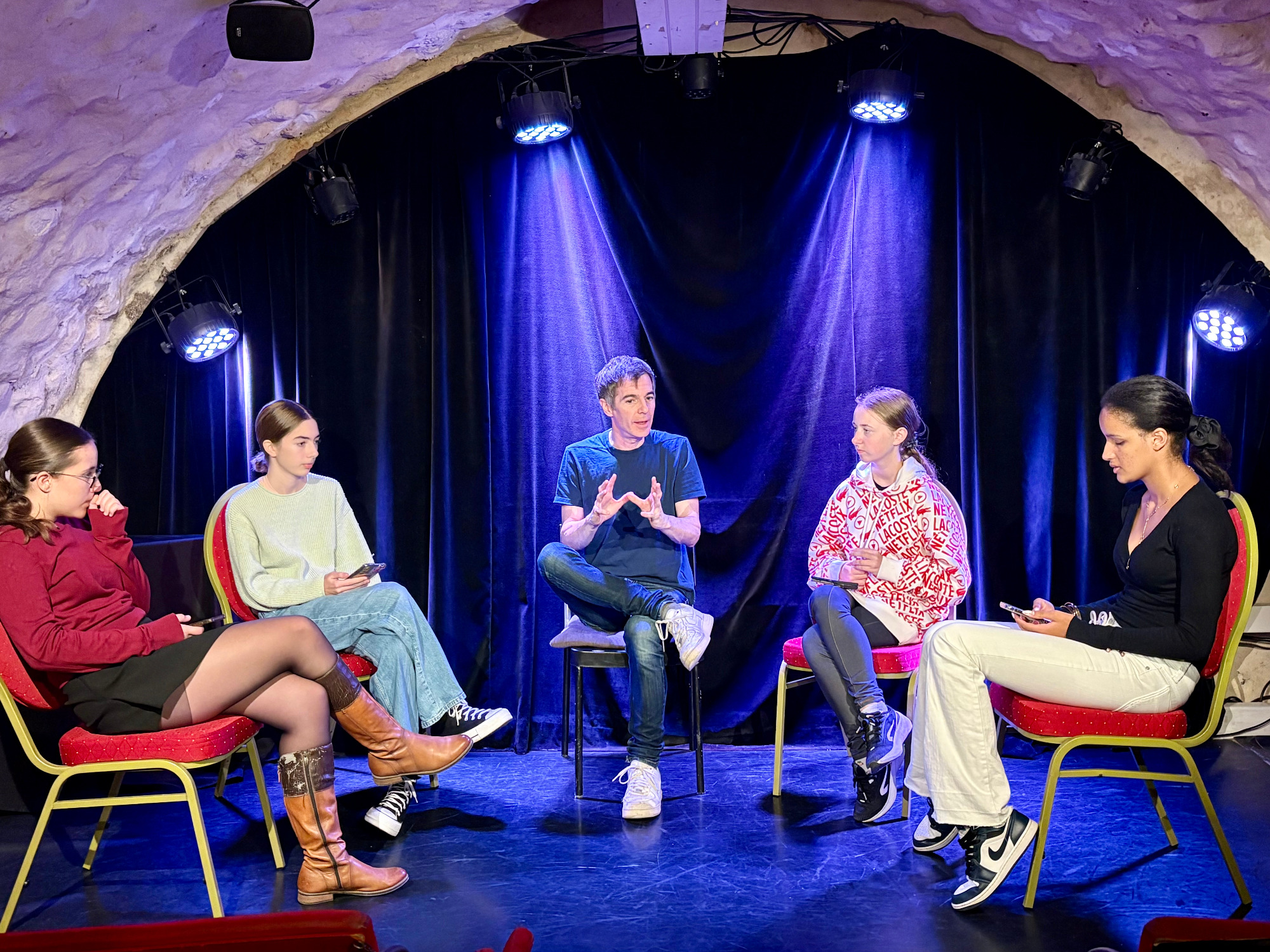 Le lendemain, Thibaut nous a fait l’honneur d’une rencontre privilégiée avec le groupe d’ados pré-pro. Ensemble, ils ont échangé, questionné, rêvé et avancé dans leur projet audacieux de cette année : l’écriture complète de leur propre spectacle.